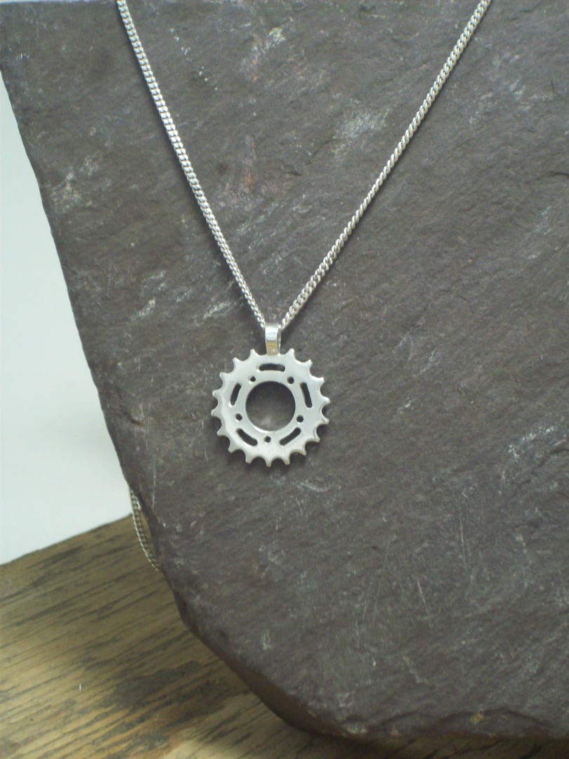 J'ai fait faire un bijou en forme de plateau de pédalier par une artisane en joallerie de lanaudière(Nancy Ferron). Deux modèles sont disponnibles: un modèle pour homme avec corde en cuir et un modèle pour femme sur chaîne. Ce sont des pièces de très grande qualité en argent sterling (0.925). Le prix est de 45$ chaqu'un (+ 10$ pour livraison). Pour ceux et celles qui sont intéressé(es), n'hésitez pas à me rejoindre à: mathieu.mongrain@hotmail.com . Il me fera un plaisir de vous aider.